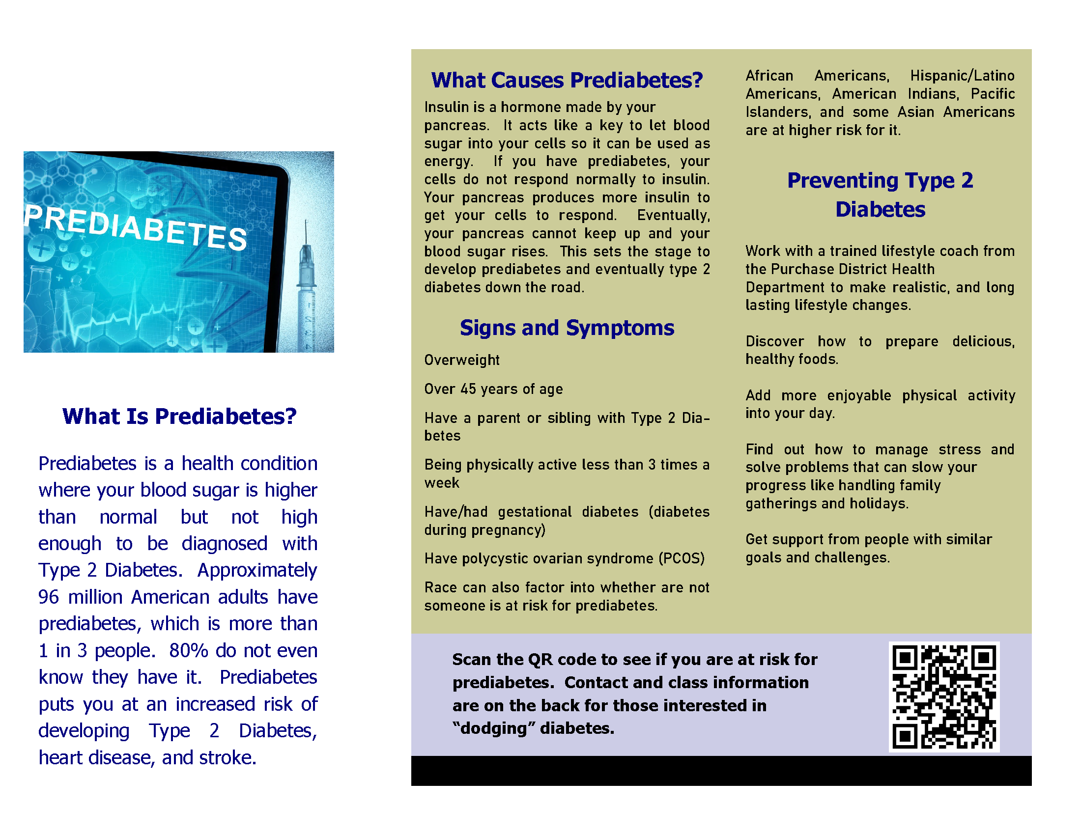 Prevent T2 Curriculum has been proven to reduce one’s risk for type 2 diabetes. It is a research-based curriculum by the Center for Disease Control. This year-long series provides information, tools and support to helping make lifestyle changes. Contact our health department to learn more about these classes. They are offered in a variety of settings to accommodate schedules: online, in-person and virtual.